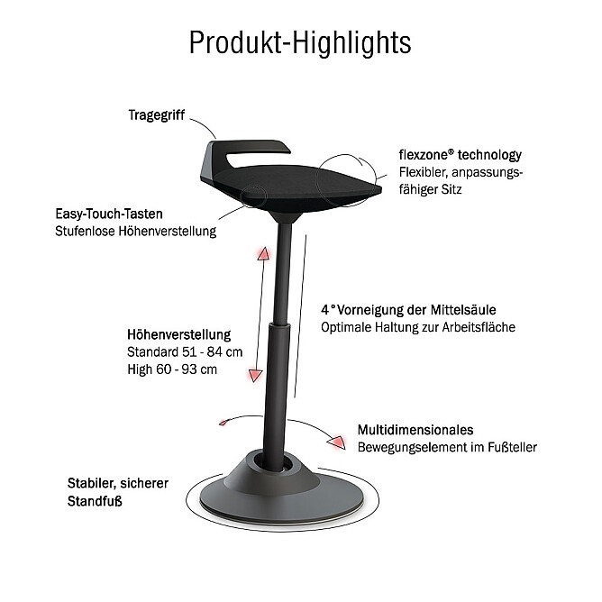 Abwechselnd hoch sitzen, halb stehen. Immer in Bewegung bleiben. Das alles kann der Muvman. Dank patentierter flexzone® Technology gibt es keine unangenehmen Druckstellen. Starres Sitzen macht krank und Stehen auf hartem Boden, ist auch keine Alternative.