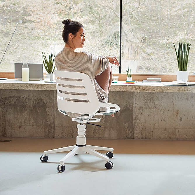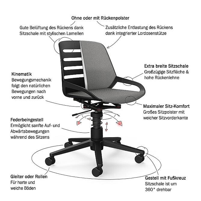 Die breite Sitzschale mit hohem Rücken und integriertem Sitzpolster besteht aus glasfaserverstärktem Polypropylen. Für eine optimale Belüftung des Rückens sorgt hierbei die Rückenlehne im Lamellendesign. Die flexible Zone der vorderen Sitzvorderkante wurde speziell entwickelt, um unangenehmen Druck auf die Oberschenkel zu vermeiden. Das innovative, patentierte Self Adjusting Motion Element (SAM) im Fußkreuz sowie die durchdachte Kinematik bieten Ihnen ein einzigartiges Sitzgefühl. Für zusätzliche Unterstützung des Rückens kann das Rückenpolster mit integrierter Lordosenstütze verwendet werden. Man kann sich entspannt zurücklehnen und sitzt dabei aufrecht. Und das Beste daran ist, das Rückenpolster kann ganz einfach durch einen Clip-In-Mechanismus angebracht oder entfernt werden.