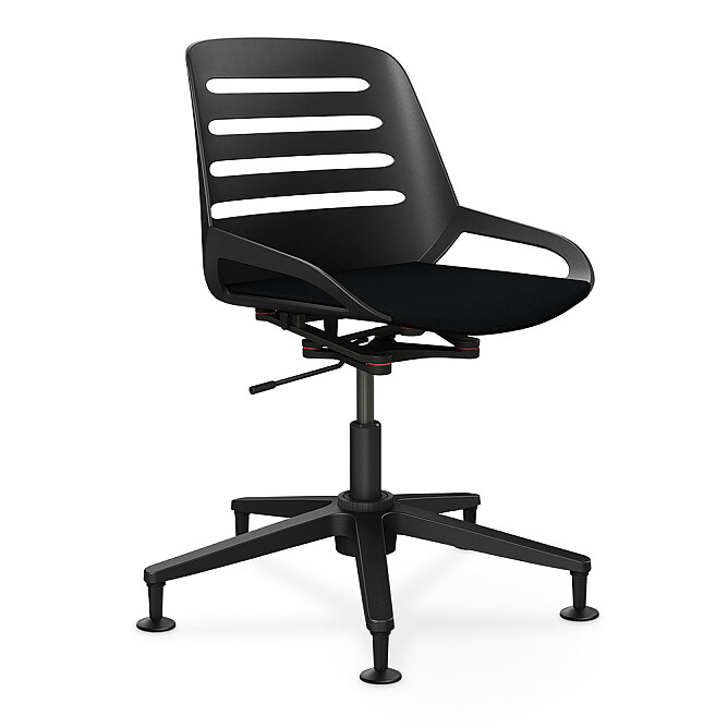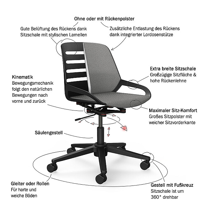 Die breite Sitzschale mit hohem Rücken und integriertem Sitzpolster besteht aus glasfaserverstärktem Polypropylen. Für eine optimale Belüftung des Rückens sorgt hierbei die Rückenlehne im Lamellendesign. Die flexible Zone der vorderen Sitzvorderkante wurde speziell entwickelt, um unangenehmen Druck auf die Oberschenkel zu vermeiden. Das innovative, patentierte Self Adjusting Motion Element (SAM) im Fußkreuz sowie die durchdachte Kinematik bieten Ihnen ein einzigartiges Sitzgefühl. Für zusätzliche Unterstützung des Rückens kann das Rückenpolster mit integrierter Lordosenstütze verwendet werden. Man kann sich entspannt zurücklehnen und sitzt dabei aufrecht. Und das Beste daran ist, das Rückenpolster kann ganz einfach durch einen Clip-In-Mechanismus angebracht oder entfernt werden.