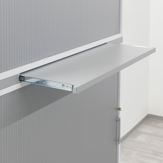 Der Auszugsboden ist die passende Ergänzung für zwei aufeinander gestapelte Schiebetürenschränke und dient beispielsweise als Ablagefläche für Ordner. Hochwertige Kugelauszüge sorgen zudem für einen leichtgängigen Auszug der Ablagefläche.