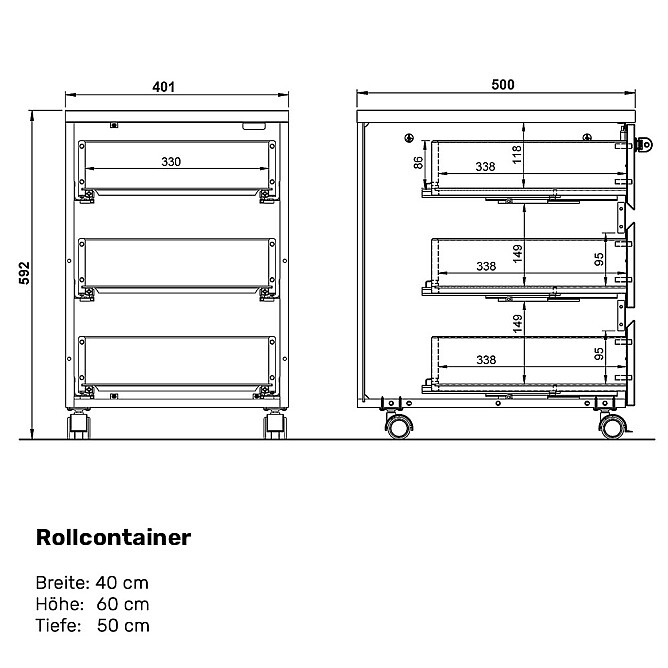 - Rollcontainer mit drei Schubladen (jeweils belastbar bis zu 10 kg)