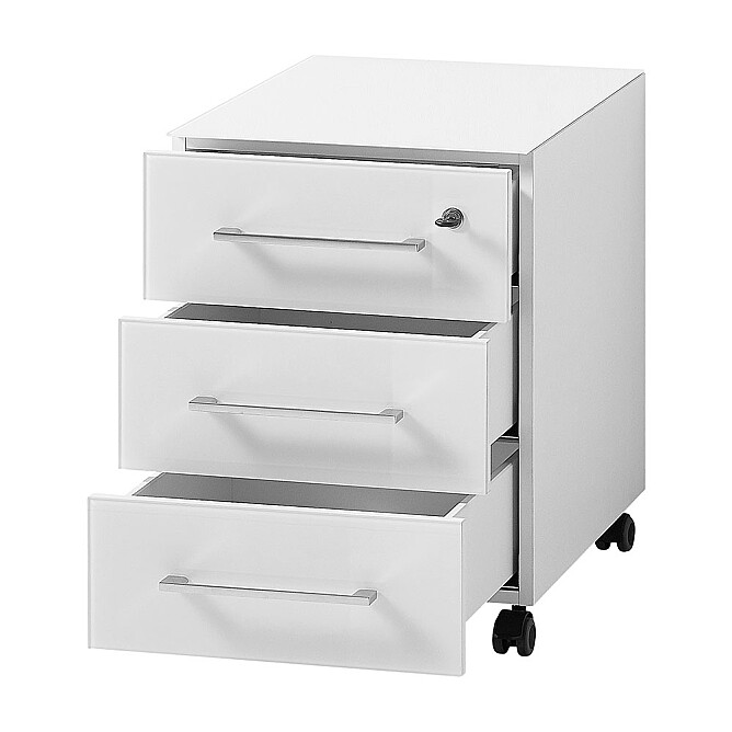 Container mit Rollen zum Unterstellen unter Schreibtische Serie Monteria. Verchromte Relinggriffe aus Metall. Die elegante Glasplatte schließt bündig mit der Schubladenkante. Sicherheitsglas mit hoher Widerstandskraft. Der Container besitzt 3 Schubladen inkl. Selbsteinzug - eine davon abschließbar.