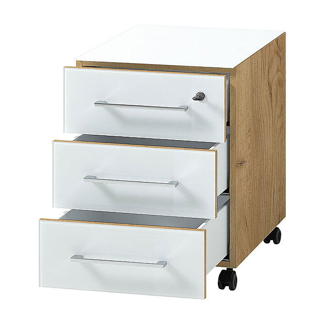 GERMANIA Monteria - Rollcontainer mit 3 Schubladen & Fronten mit Glasauflage / Dekor: Navarra-Eiche / Weiß