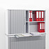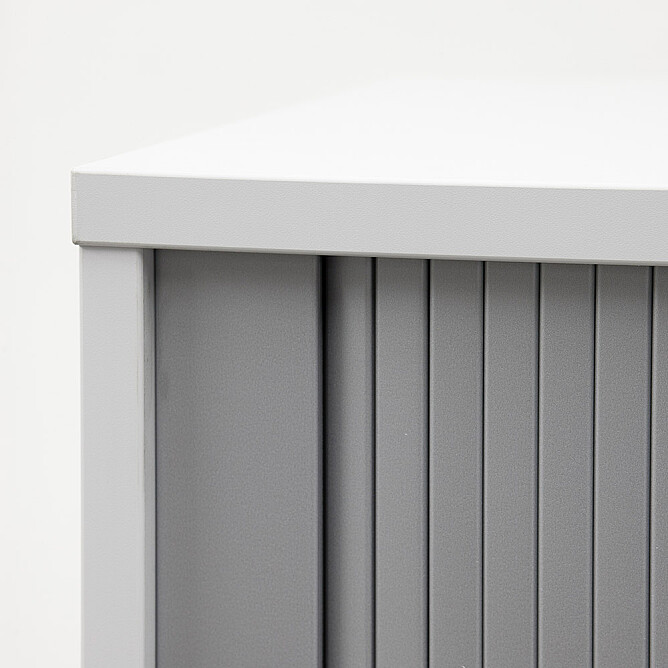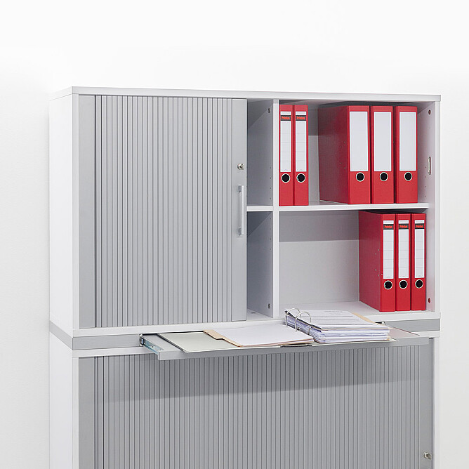 Ein absoluter Pluspunkt für beengte Platzverhältnisse: Im Vergleich zu normalen Aktenschränken mit Türen nimmt der Rollladen-Schrank keinen weiteren Schwenkbereich in Anspruch. Besonders praktisch: Der Rollladenschrank ist stapelbar und kann je nach Bedarf mit weiteren Schränken kombiniert werden.