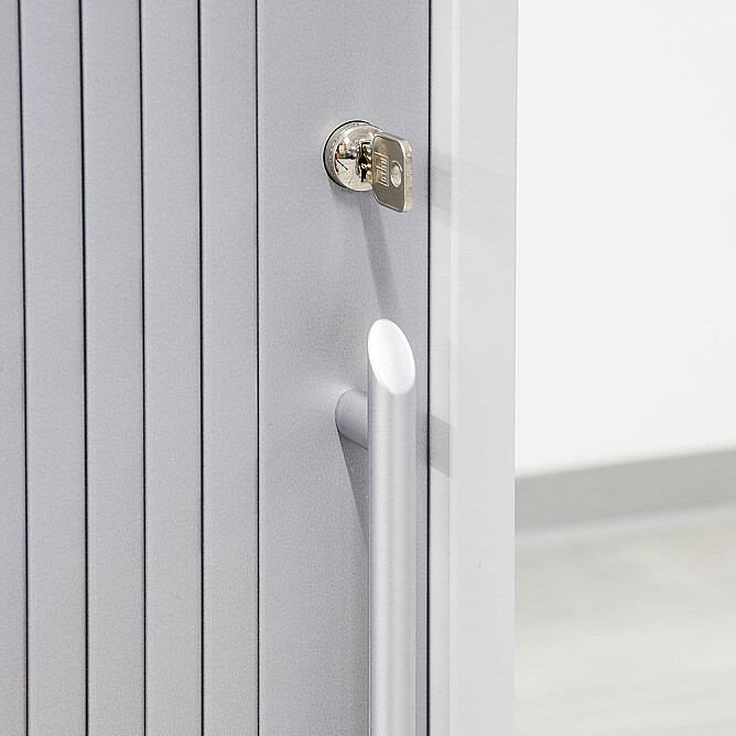 Der abschließbare Rollladenschrank Basic bietet praktischen und platzsparenden Stauraum für Akten und Unterlagen. Hochwertige Führungsschienen und langlebiger Kunststoff sorgen für ein müheloses und elegantes Auf- und Zuschieben der Rollläden – so sind Akten immer gut geordnet und bei Bedarf griffbereit. Dank des eingebauten Schlosses gewährleistet der Schrank zusätzlich eine datenschutzkonforme Aktenaufbewahrung. Im Handumdrehen verschwinden sensible Daten hinter dem Rollladen und bleiben vor fremden Blicken geschützt.