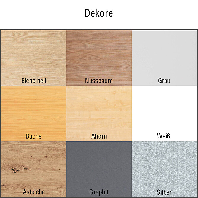 Mit insgesamt 6 Korpus- und 8 Schiebetüren-Farben können Sie Ihren ganz individuellen Aktenschrank zusammenstellen - ganz nach Ihrem Geschmack und Einrichtungsstil. Zusätzlich haben Sie die Wahl zwischen 5 verschiedenen Griffarten.
