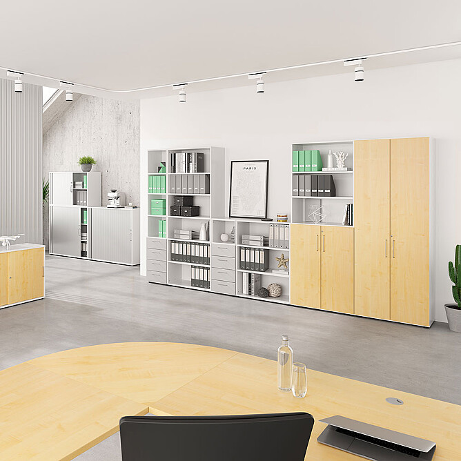 Impression: Schreibtisch Y in Kombination mit Hammerbacher Schränken und Meetingstühlen.