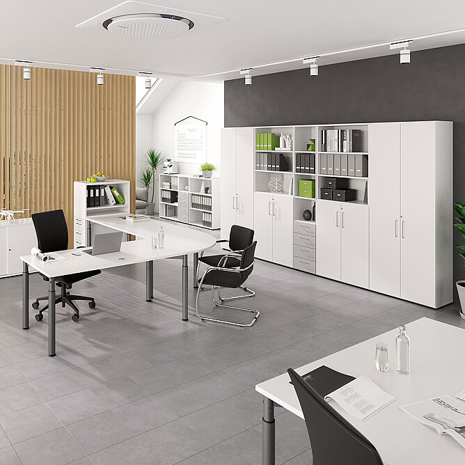 Impression: Schreibtisch Y in Kombination mit Hammerbacher Schränken und Meetingstühlen.