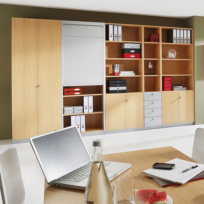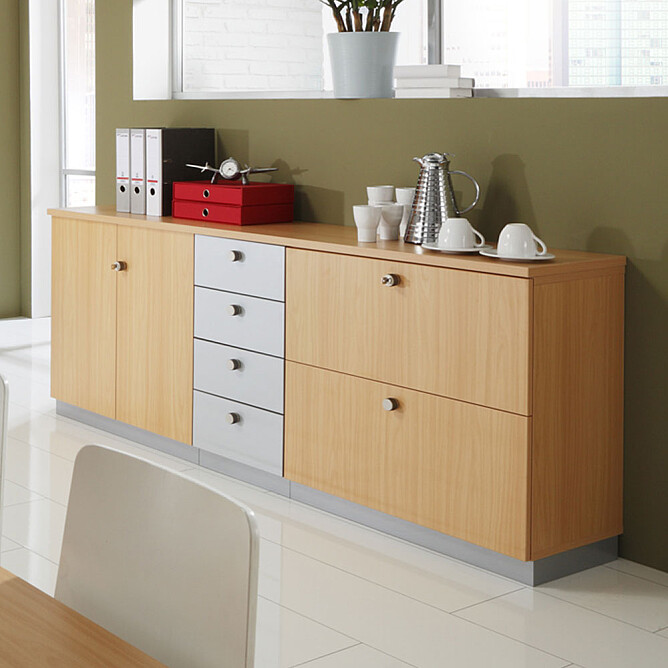 Der Stahlsockel ersetzt die üblichen Sockelfüße und sorgt für eine geschlossene Front zwischen Möbelstück und Fußboden, wodurch Ihre Schränke einen schönen Abschluss findet. Die gesamte Optik wirkt aufgeräumter und verleiht Ihrem Büro einen klaren Stil.