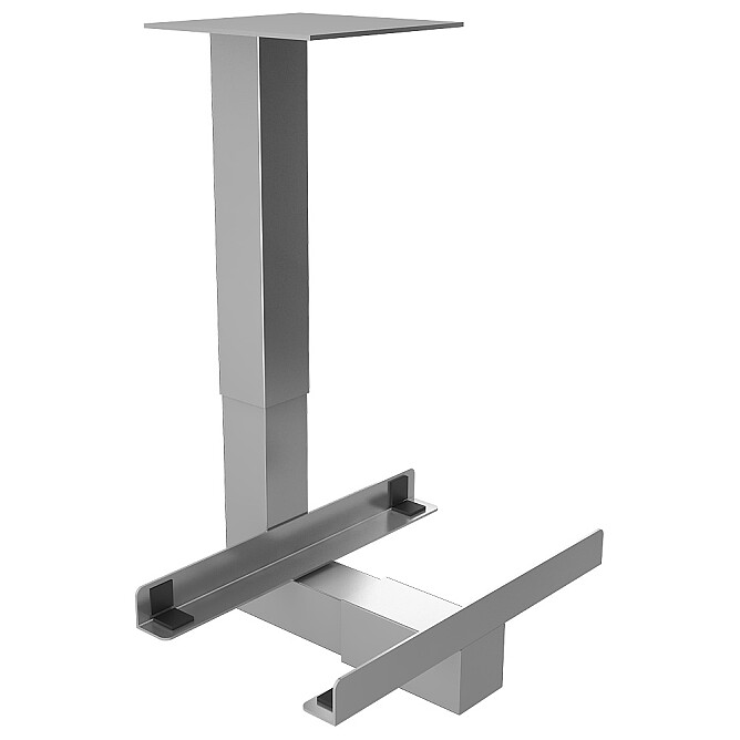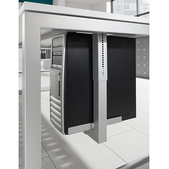 Diese PC-Halterung lässt sich an alle Hammerbacher Schreibtische montieren, hierbei ist die Position frei wählbar. So können Sie Ihren PC in der gewünschten Höhe unterhalb der Tischplatte anbringen.