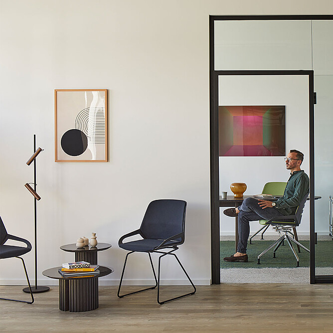 Eine weitere Besonderheit des Konferenzstuhls ist der Stoffbezug Cura, der ihm eine warme Ästhetik und eine angenehme Haptik verleiht. Durch seine hohe Scheuerfestigkeit eignet sich der Cura-Bezug perfekt für den Büro- und Wohnbereich. Außerdem überzeugt der Stoff in Punkto Nachhaltigkeit. Er wurde nach dem OEKO-TEX® STANDARD 100 auf mögliche Schadstoffe geprüft und besteht zu 100 % aus recyceltem Post-Consumer-Polyester.