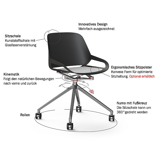 Die Sitzschale besteht aus hochwertigem Polypropylen/Polyamid. Die Kinematik verbindet die Sitzschale mit dem Gestell und folgt den Bewegungen des Nutzers - nach vorne und nach hinten - ein komplett neues Sitzgefühl. Das zeitlos moderne Fußkreuz-Gestell mit Rollen ist bis zu 120 kg belastbar. Das mehrfach ausgezeichnete Numo-Design von Andreas Ostwald rundet das Bild ab und setzt neue Maßstäbe in Design und Funktionalität. Ein optionales Design-Element ist zudem das rutschfeste Sitzpolster in 5 verschiedenen Farben. >> Numo Sitzkissen