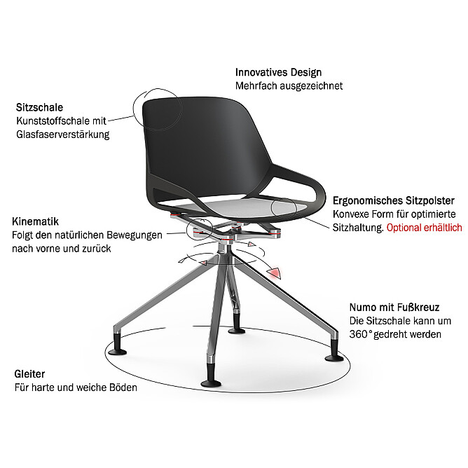 Die Sitzschale besteht aus hochwertigem Polypropylen/Polyamid. Die Kinematik verbindet die Sitzschale mit dem Gestell und folgt den Bewegungen des Nutzers - nach vorne und nach hinten - ein komplett neues Sitzgefühl. Das zeitlos moderne Fußkreuz-Gestell mit Gleitern ist bis zu 120 kg belastbar. Das mehrfach ausgezeichnete Numo-Design von Andreas Ostwald rundet das Bild ab und setzt neue Maßstäbe in Design und Funktionalität. Ein optionales Design-Element ist zudem das rutschfeste Sitzpolster in 5 verschiedenen Farben. >> Numo Sitzkissen