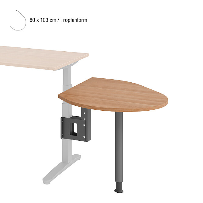 Vergrößern Sie Ihren Wunschschreibtisch mit unseren verschiedenen Ansatztischen. Jede Anpauplatte kommt mit einem höhenverstellbaren Stützfuß und eignet sich somit auch für schwere Geräte, wie z.B. einen Drucker. Zur einfachen Montage sind bereits Vorbohrungen an Ihrem Hammerbacher Schreibtisch vorhanden.