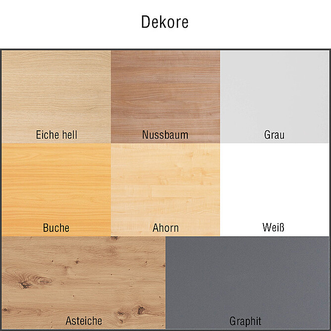 Die Hammerbacher Anbau- und Verkettungsplatten sind in verschiedenen Formen und Dekoren erhältlich. Die 25 mm dicke Tischplatte besteht aus einer melaminharzbeschichteten Spanplatte nach DIN 68765 und verfügt über eine gerundete 2 mm Kunststoffkante.