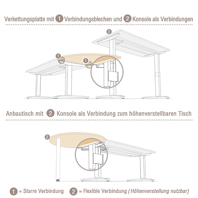Jetzt stellt sich noch die Frage nach der Verbindungsart. Wenn Ihr Schreibtisch über keine Höhenverstellung verfügt, dann kommen starre Verbindungsbleche zum Einsatz (Abbildung 3). Im Gegenzug wird bei einem höhenverstellbaren Schreibtisch eine Konsole benötigt, welche eine flexible Verbindung mit Höhenverstellung ermöglicht. (Abbildung 4).