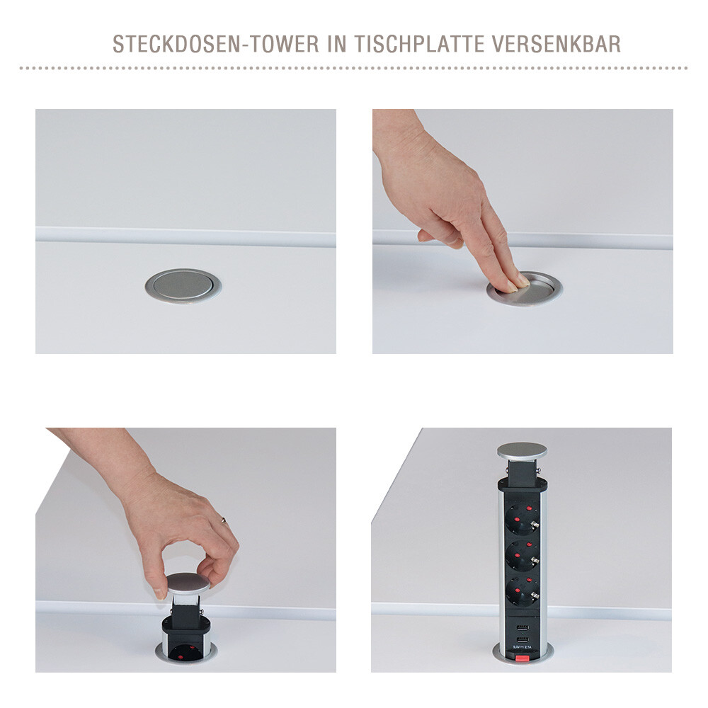 Der versenkbare Tower Power bietet auf kleinsten Raum jede Menge Anschlüsse - so erhalten Sie 3 Stromanschlüsse und 2 USB-Charger. Das Gehäuse besticht mit einer hochwertigen Verarbeitung aus Aluminium und sorgt für eine aufgeräumte Optik.
