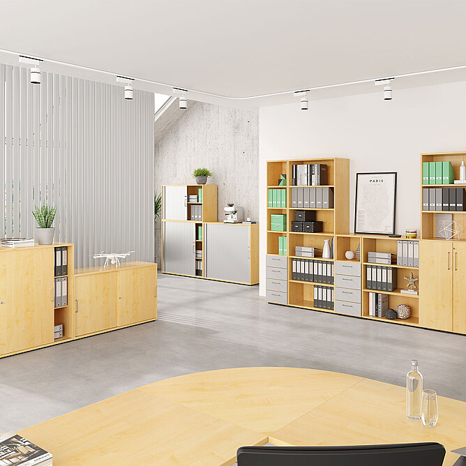 Impression: Schreibtisch Y in Kombination mit Hammerbacher Schränken und Meetingstühlen.