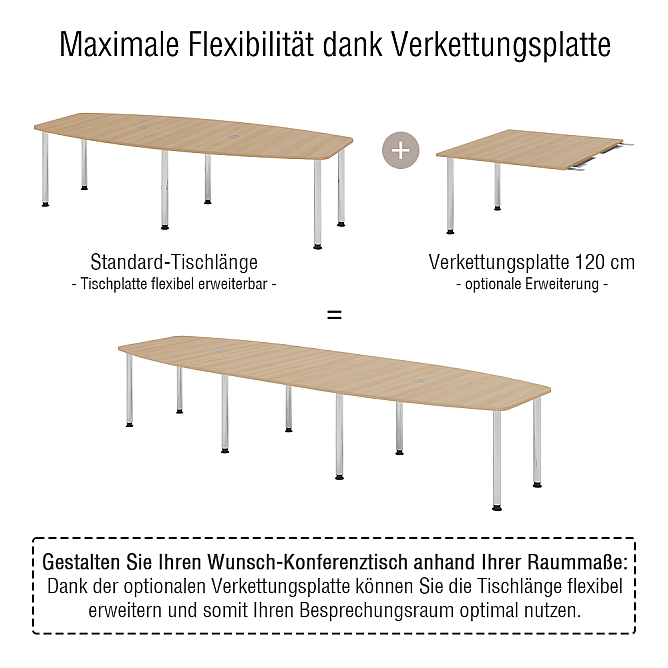 Mit der optionalen Verkettungsplatte kann die Tischgröße zusätzlich erweitert werden, um noch mehr Platz zu schaffen. Dank der integrierten Kabeldosen und Kabelklemmen herrscht zudem stets Ordnung im Meetingraum, da überschüssige Kabel gebündelt unterhalb des Tisches verlaufen.