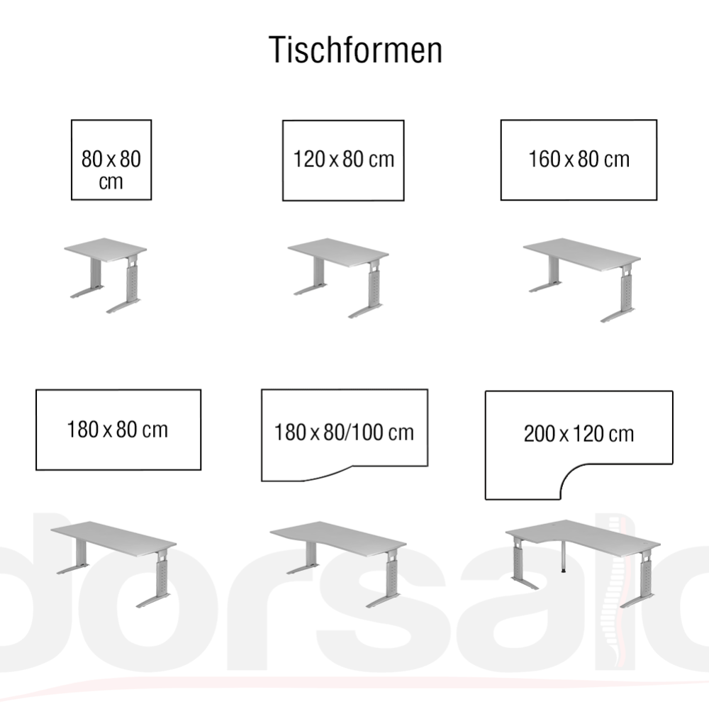 Mit 7 verschiedenen Tischformen und 7 Dekoren können Sie Ihren ganz individuellen Schreibtisch zusammenstellen – ganz nach Ihrem Geschmack und Einrichtungsstil. Ganz neu im Sortiment, allerdings noch nicht abgebildet, ist das Tischplattendekor Graphit - sprechen Sie uns bei Interesse gerne an! Ebenfalls auf Anfrage sind auch Sondergrößen möglich. Zusätzlich haben Sie zahlreiche Anbau- und Erweiterungsmöglichkeiten: Anbauplatten zur Vergrößerung der Arbeitsfläche und Verbindungsplatten zum Verbinden mehrerer Schreibtische.