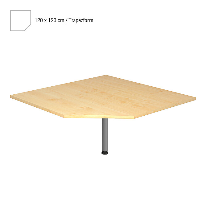 Die Hammerbacher Anbau- und Verkettungsplatten sind in verschiedenen Formen und Dekoren erhältlich. Die 25 mm dicke Tischplatte besteht aus einer melaminharzbeschichteten Spanplatte nach DIN 68765 und verfügt über eine gerundete 2 mm Kunststoffkante.