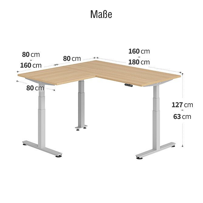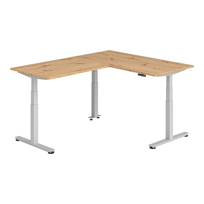Hammerbacher Winkelschreibtisch Serie XDSMW - elektrisch höhenverstellbar Größe: 160x160 cm / Dekor: Ahorn / Gestell-Farbe: Silber