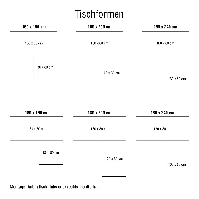 | Erhältlich in folgenden Tischgrößen: | |||||||||